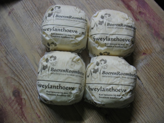“Er zijn nog maar een paar bedrijven die Boeren-Leidse kaas maken”, vertelt Kees. “Een uniek product dus, dat al eeuwen wordt gemaakt. De kaas heeft als een van de weinige kazen in Nederland een Beschermde Oorsprong Benaming (BOB). ‘Met sleutels’ verwijst naar de sleutels die je op de kenmerkende bruinrode korst ziet staan, hieraan herken je de echte Boeren-Leidse. En natuurlijk aan de smaak. Het is een 30+ kaas met de pittige smaak van komijn.” Kees en Ruud gebruiken voor de kaas en de roomboter de melk van hun eigen koeien. Ruud: “Onze koeien grazen op de Sweylantpolder. We maken de kaas met afgeroomde melk. De room die we afscheppen is de grondstof voor onze lekkere roomboter.”